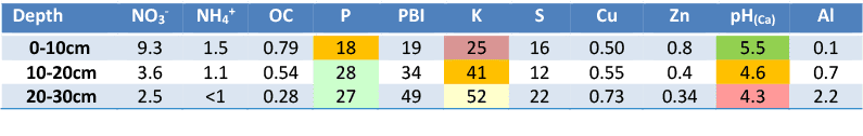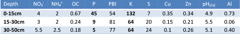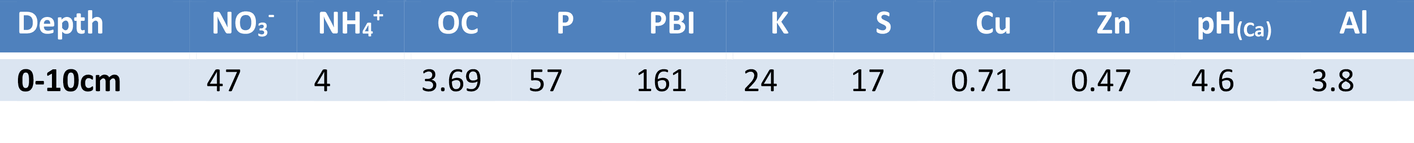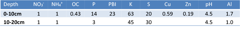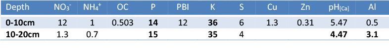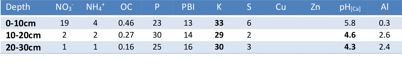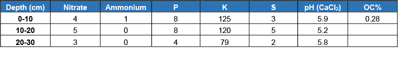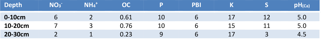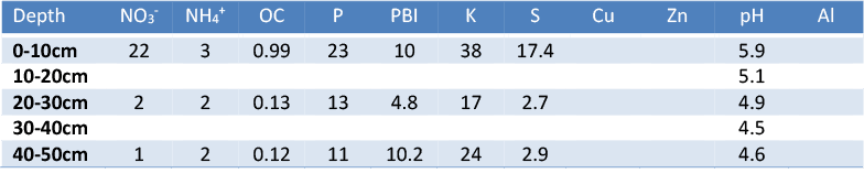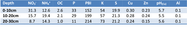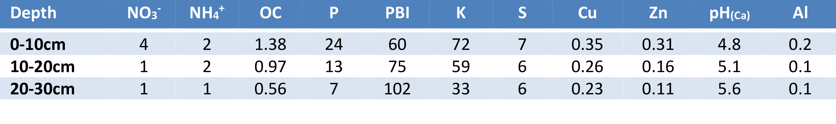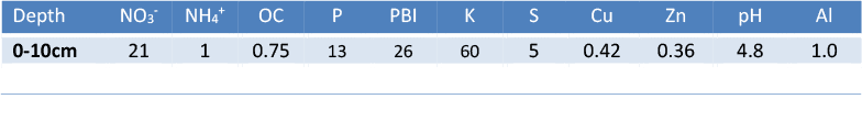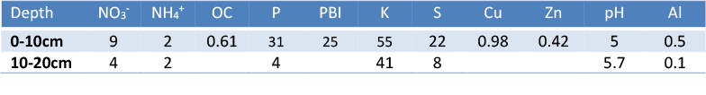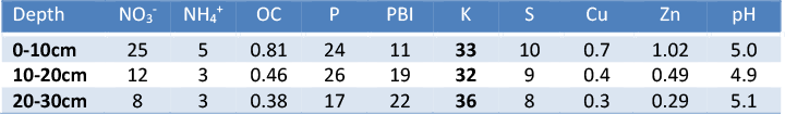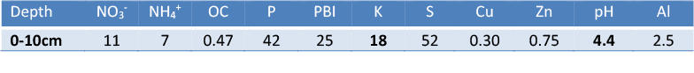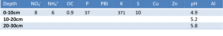Soil test data suggested this trial would respond more to potassium than phosphorus with Colwell K levels of 25 to 52 ppm down to 30cm depth and phosphorus levels from 18 to 28 ppm with a PBI of under 50.