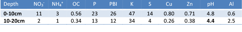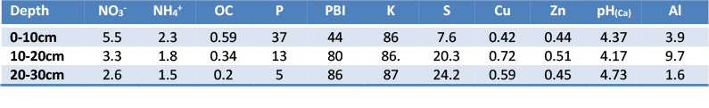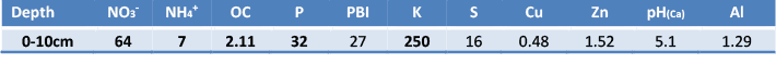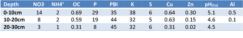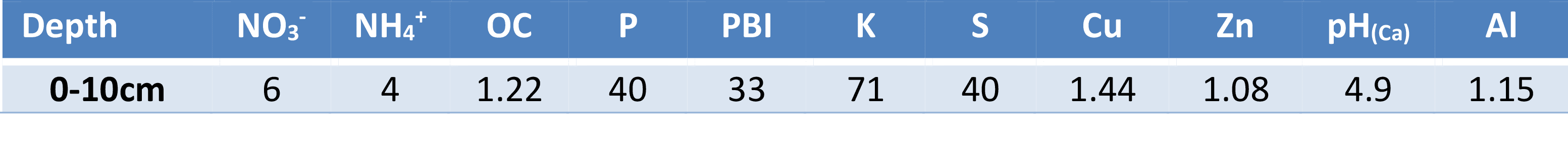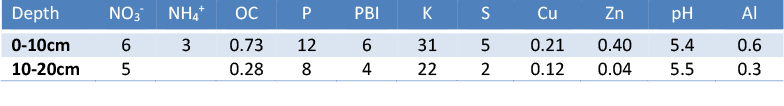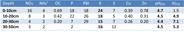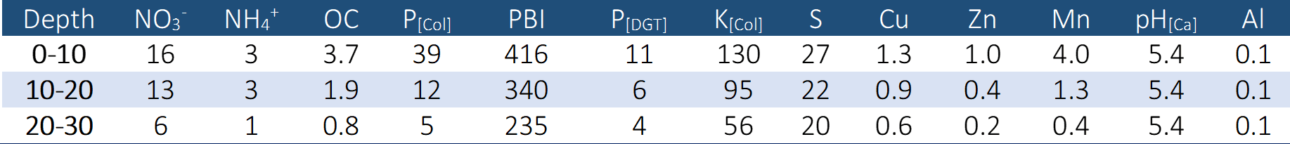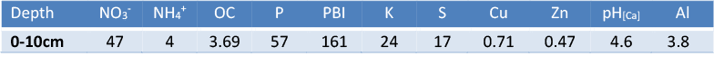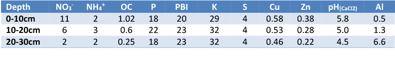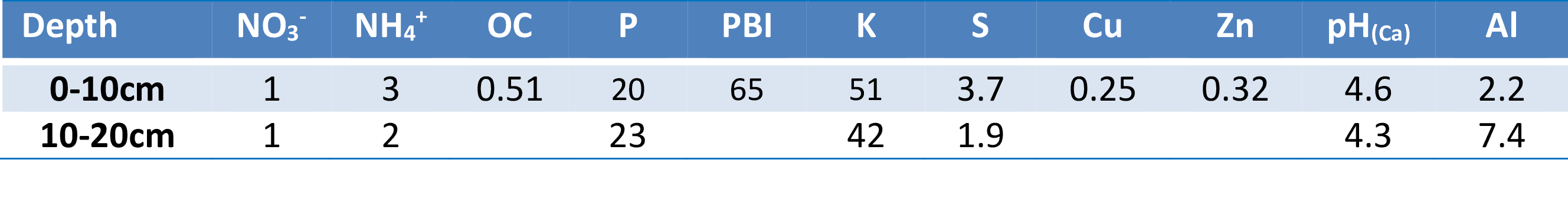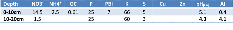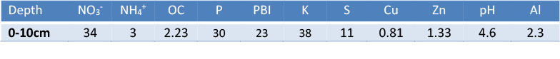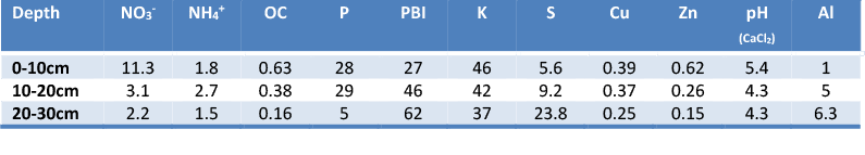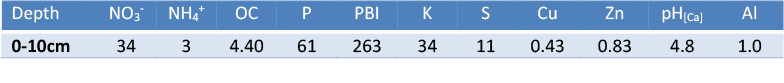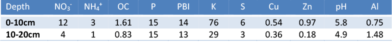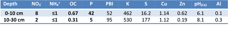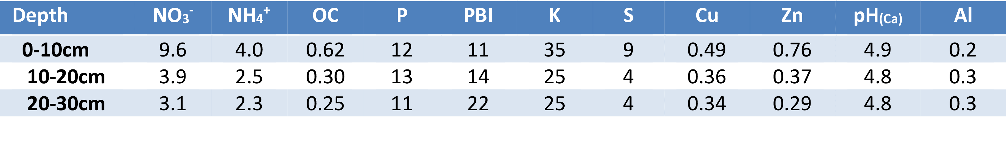 Soil test data suggested this trial would respond more to potassium than phosphorus with Colwell K levels of 25 to 52 ppm down to 30cm depth and phosphorus levels from 18 to 28 ppm with a PBI of under 50.