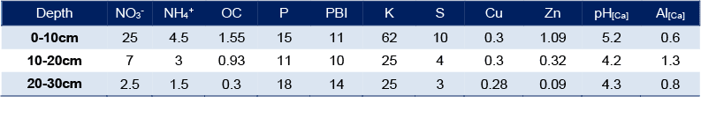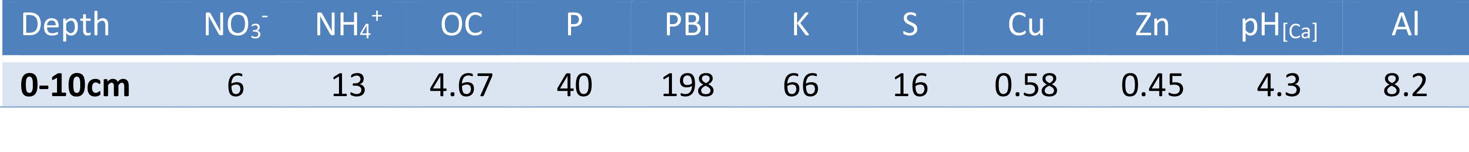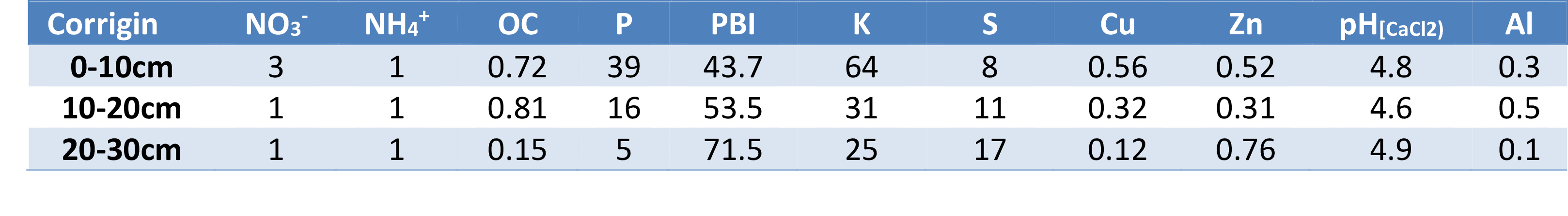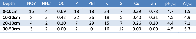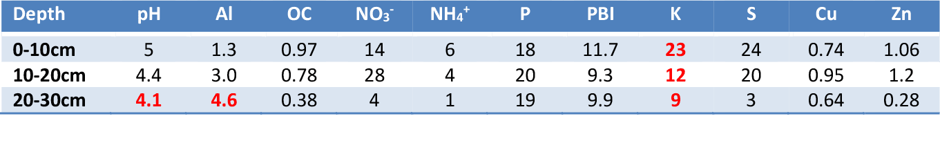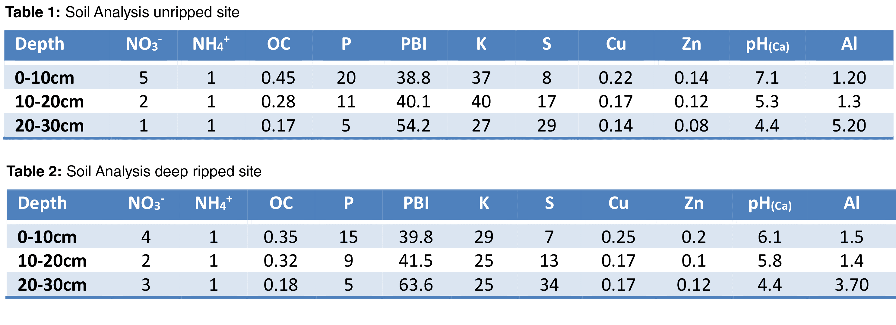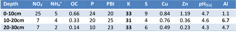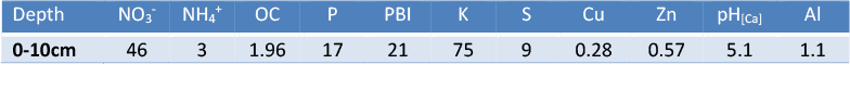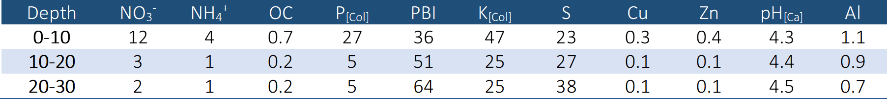 Soil test data suggested this trial would respond more to potassium than phosphorus with Colwell K levels of 25 to 52 ppm down to 30cm depth and phosphorus levels from 18 to 28 ppm with a PBI of under 50.