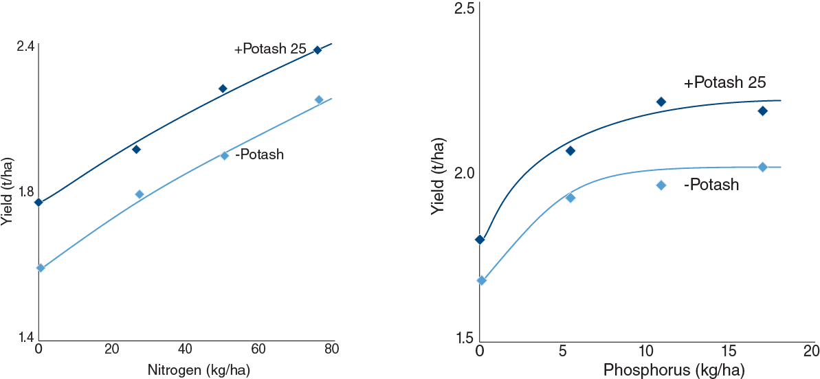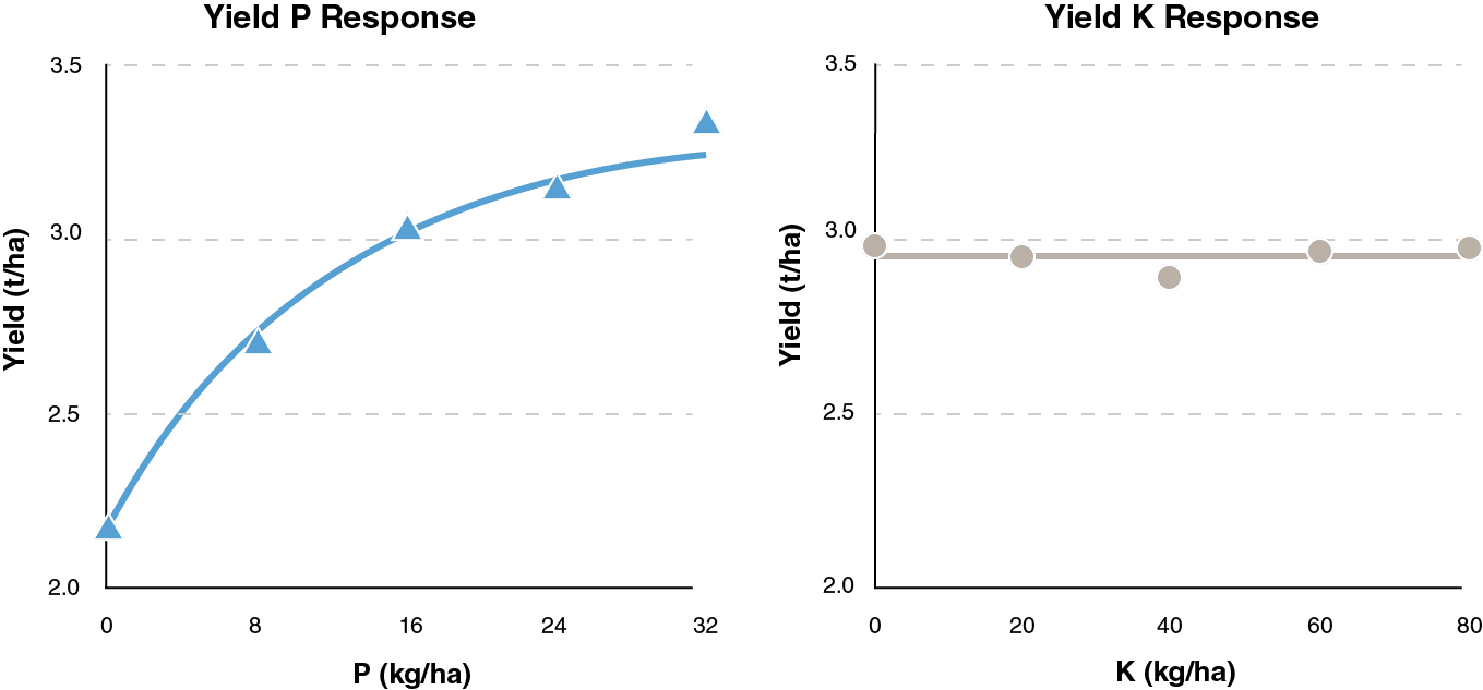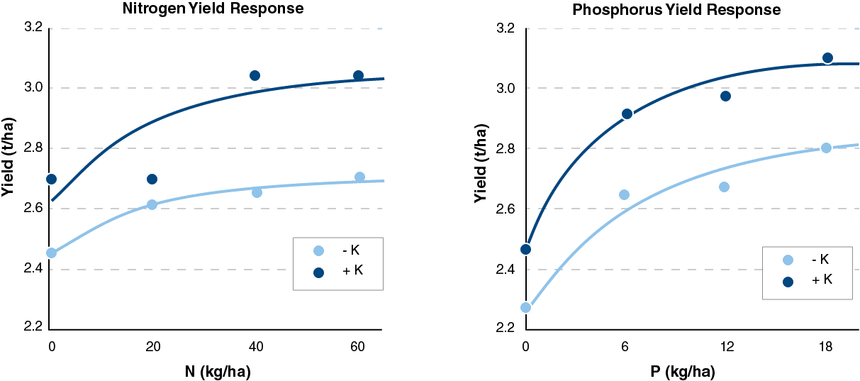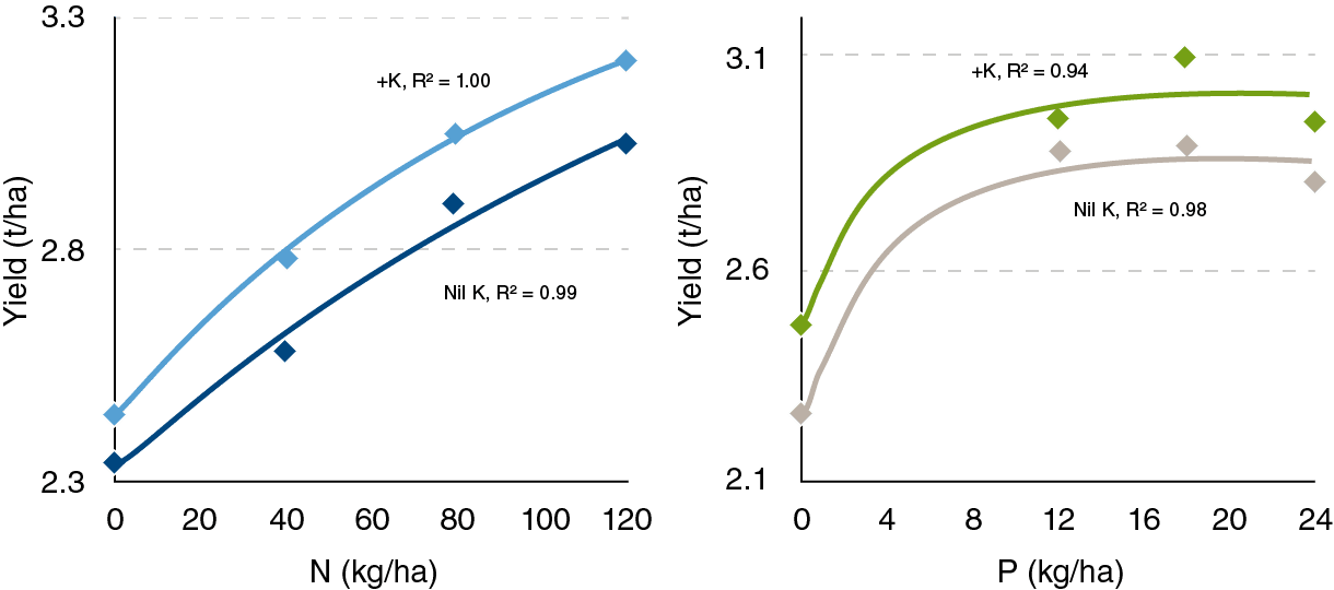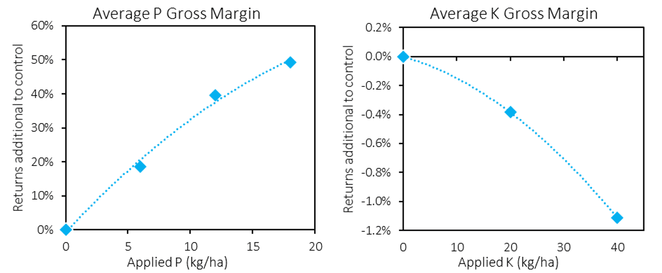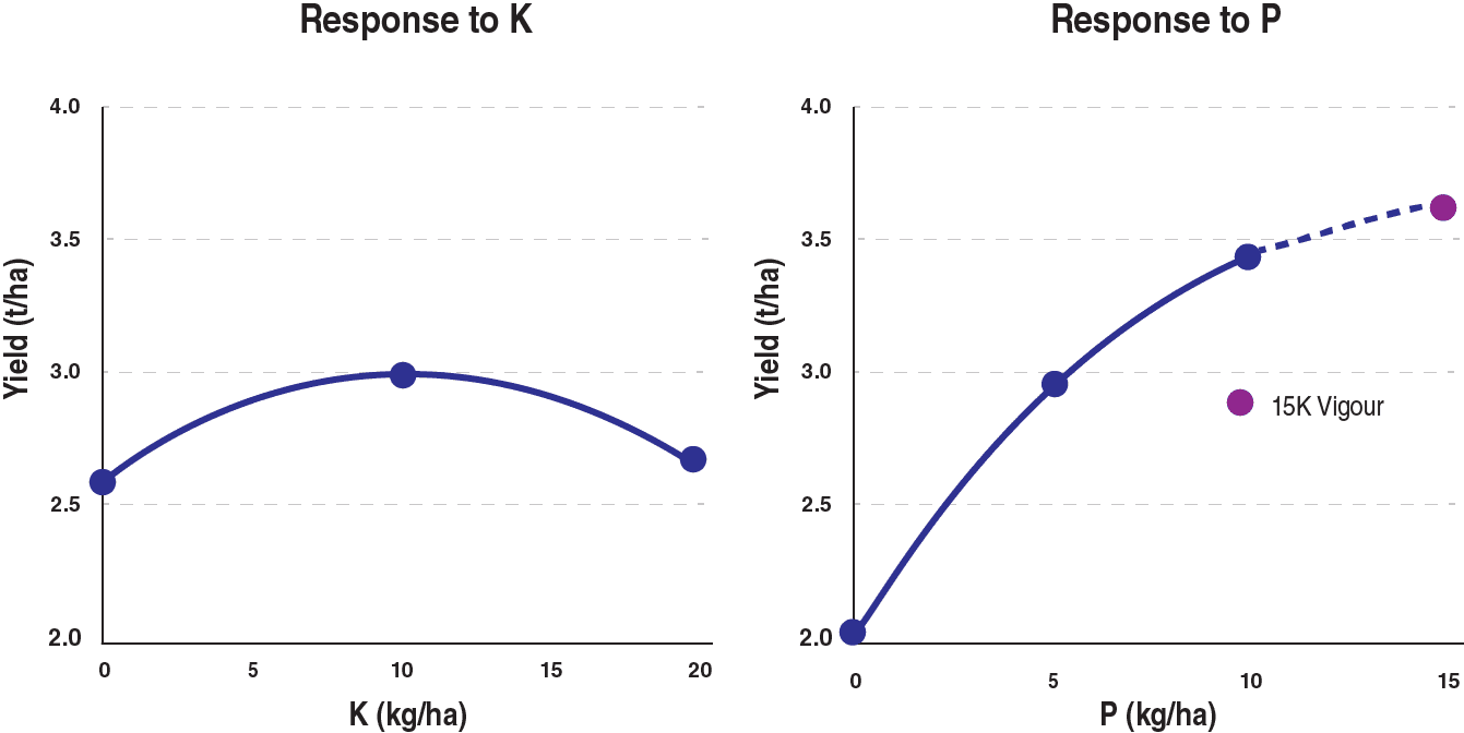 Average yield and gross margin response curves suggested phosphorus was optimised at 15 kg/ha and potassium at 10 kg/ha.