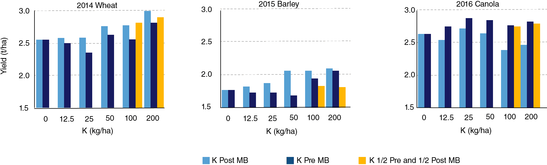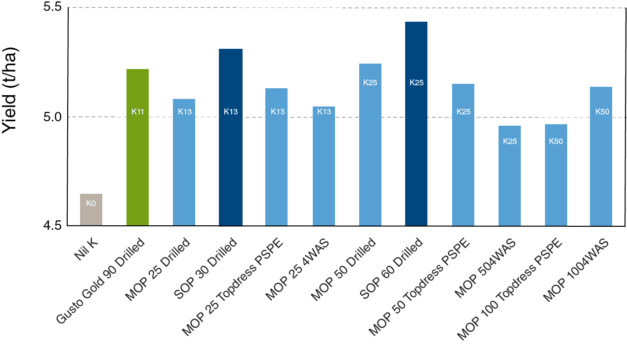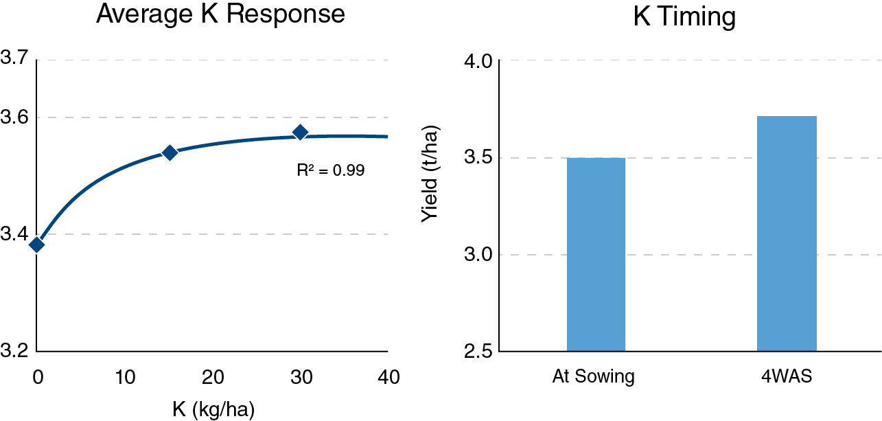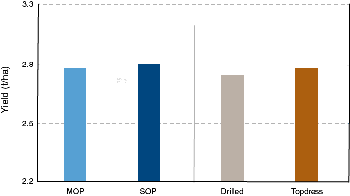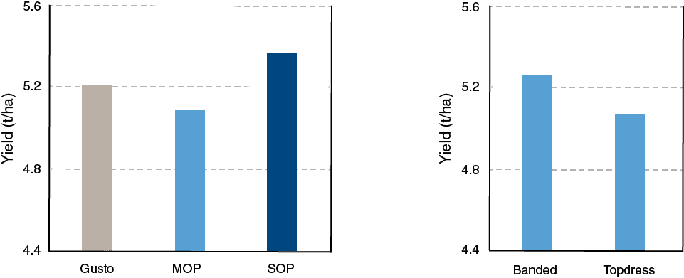 - Yields ranged from 2.1t/ha to 2.5t/ha, but were not significantly affected by K source, timing, or rate.
