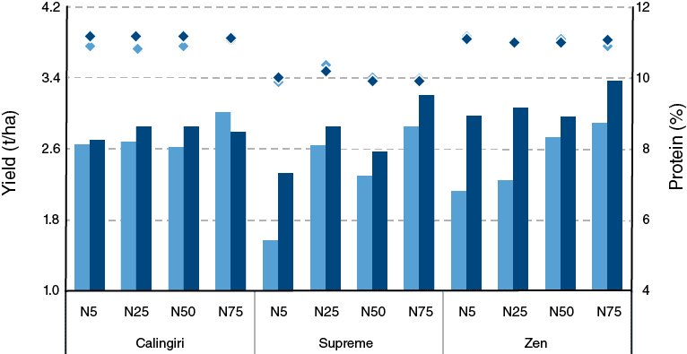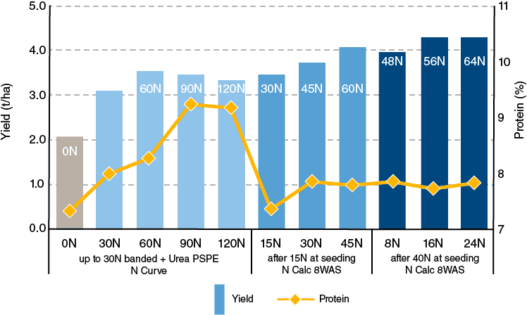- Increasing N rates decreased yield up to 120kg N/ha, but increased grain protein (range 14.5% to 17.1%).
