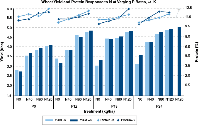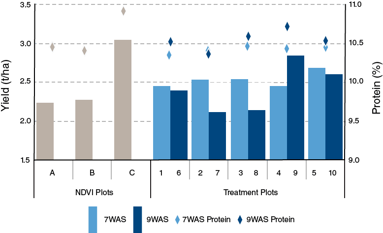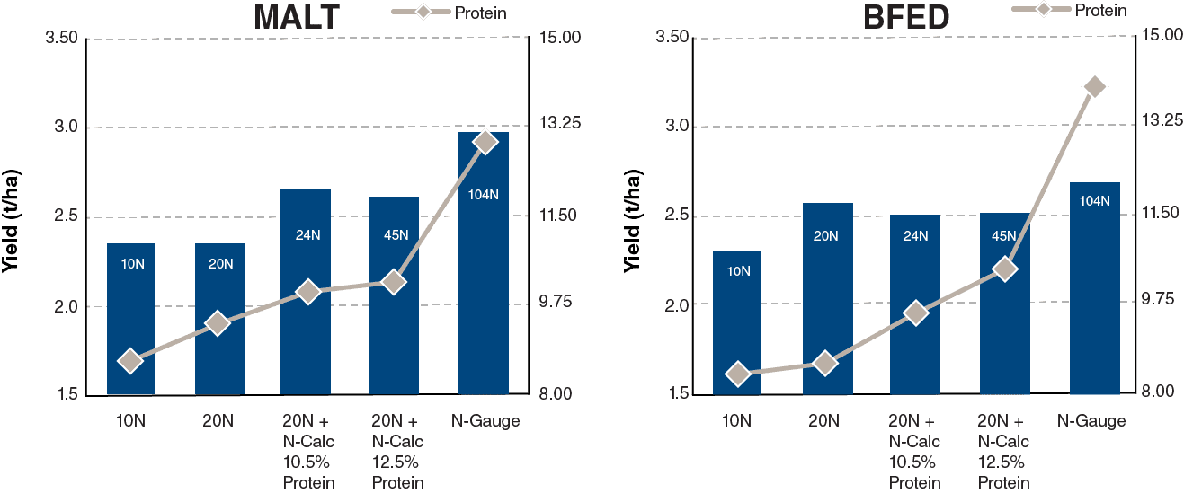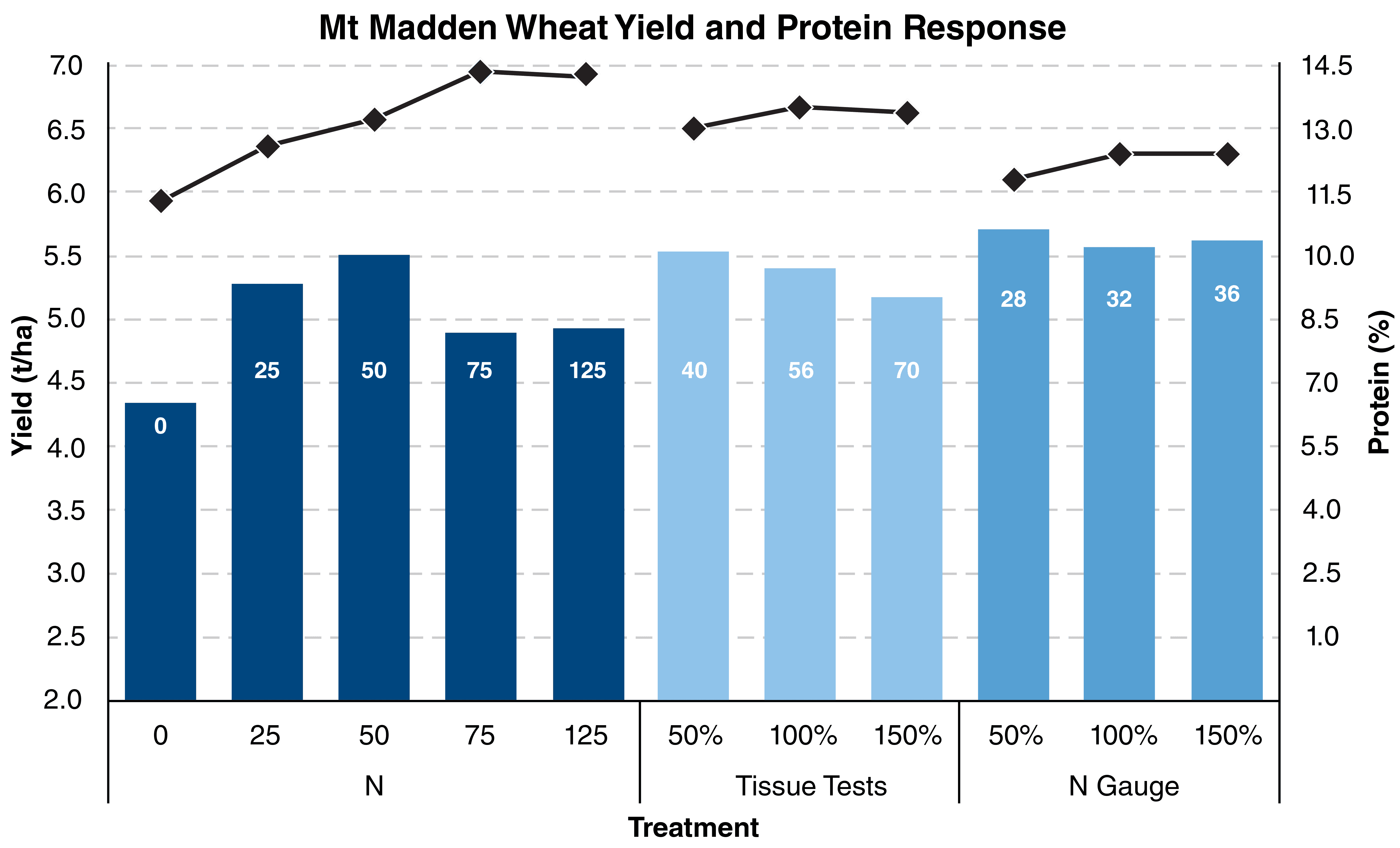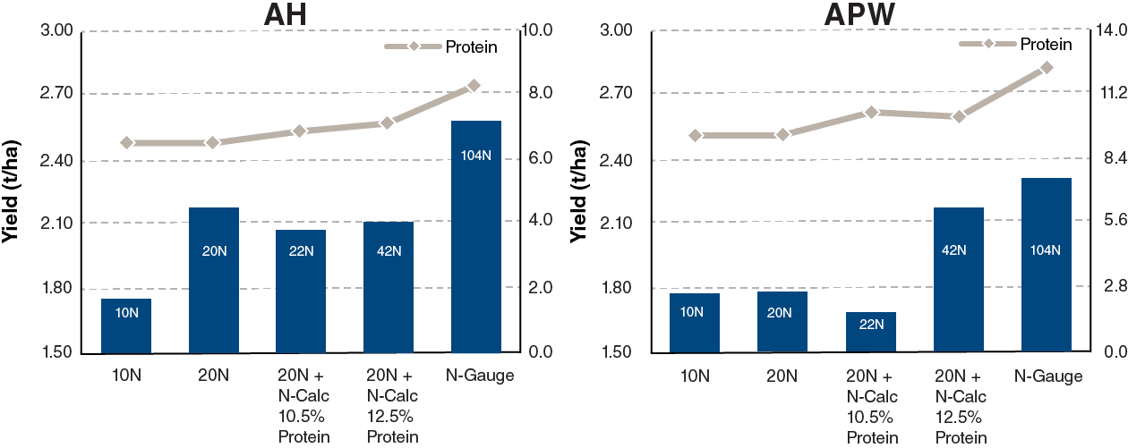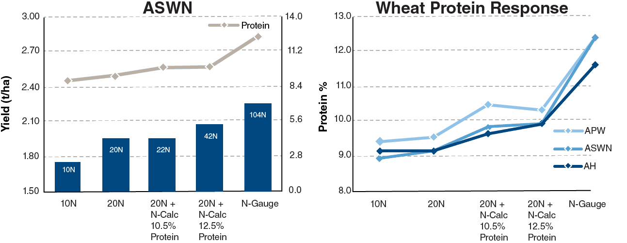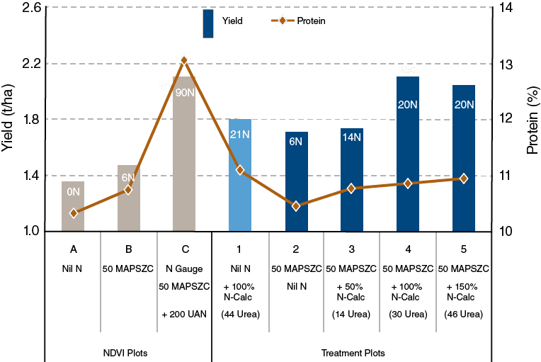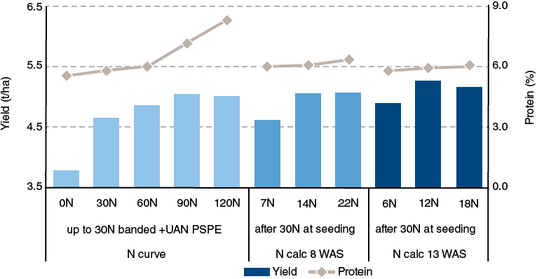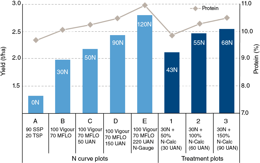 Notable also is the yield and protein response to the N-gauge treatments of 104 kg/ha of nitrogen upfront.
