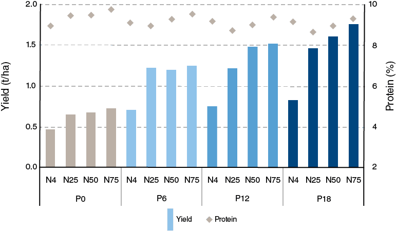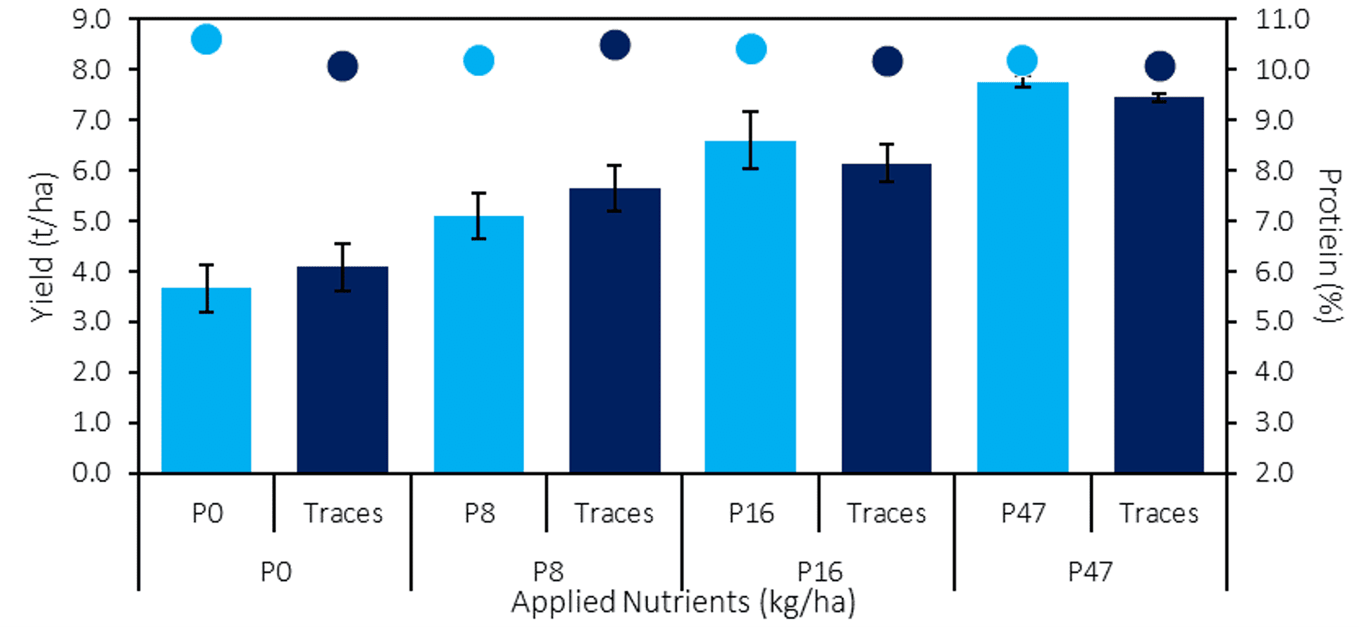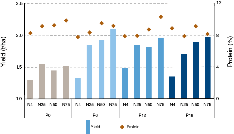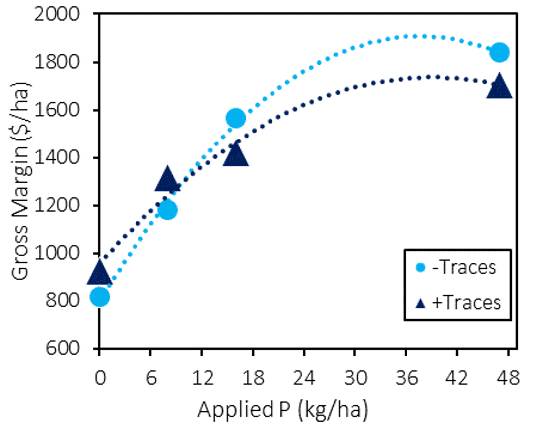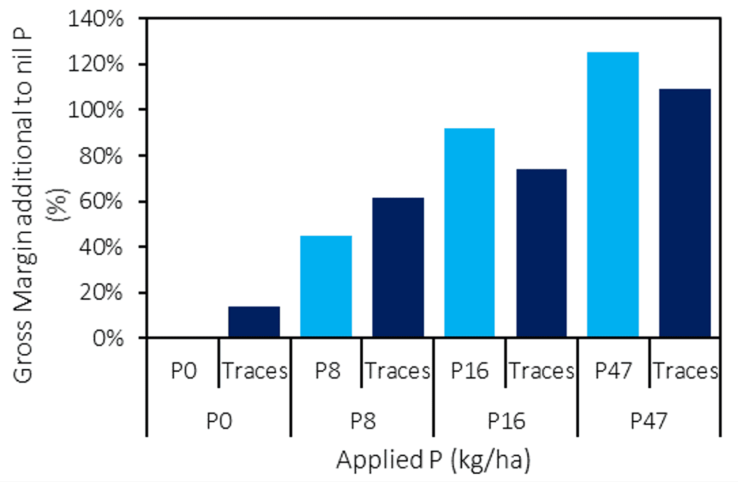 - Gross margins followed the same trend as the grain yield as increased yield was more than enough to cover the extra cost of fertiliser input, up to 25kg P/ha