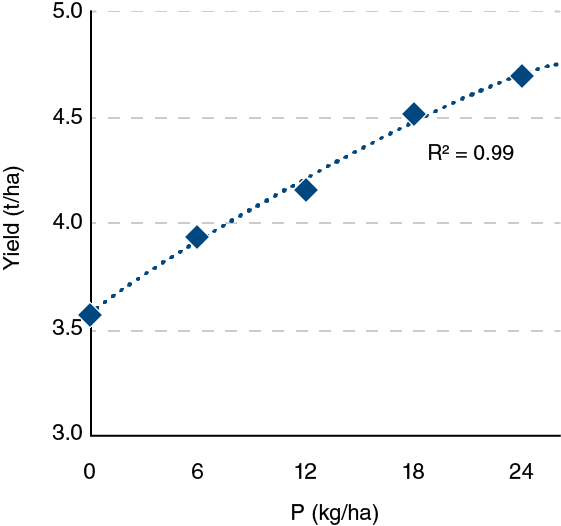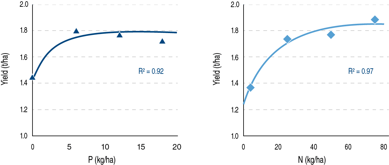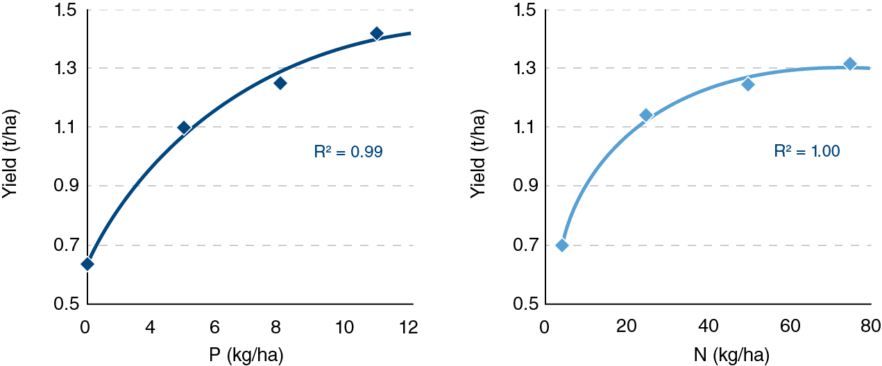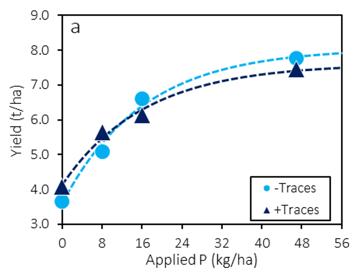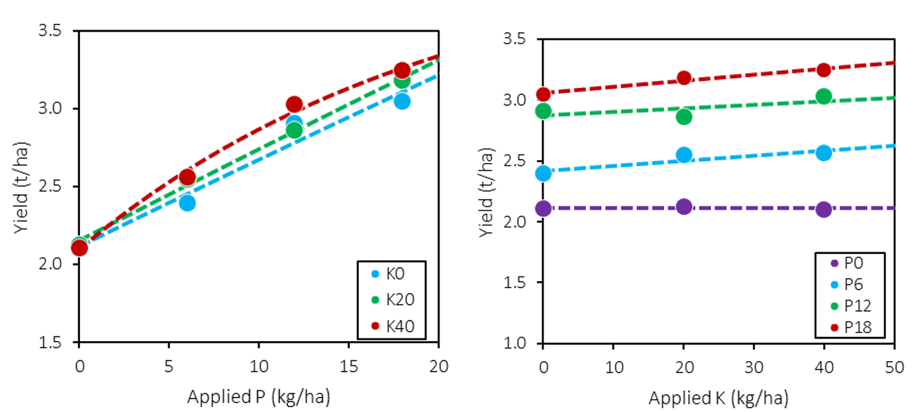 - Biomass and harvest yield increased with a application of P, but did not increase further with more than 6kg P/ha applied.