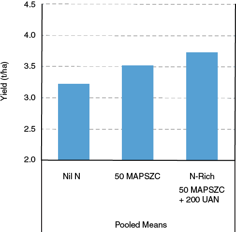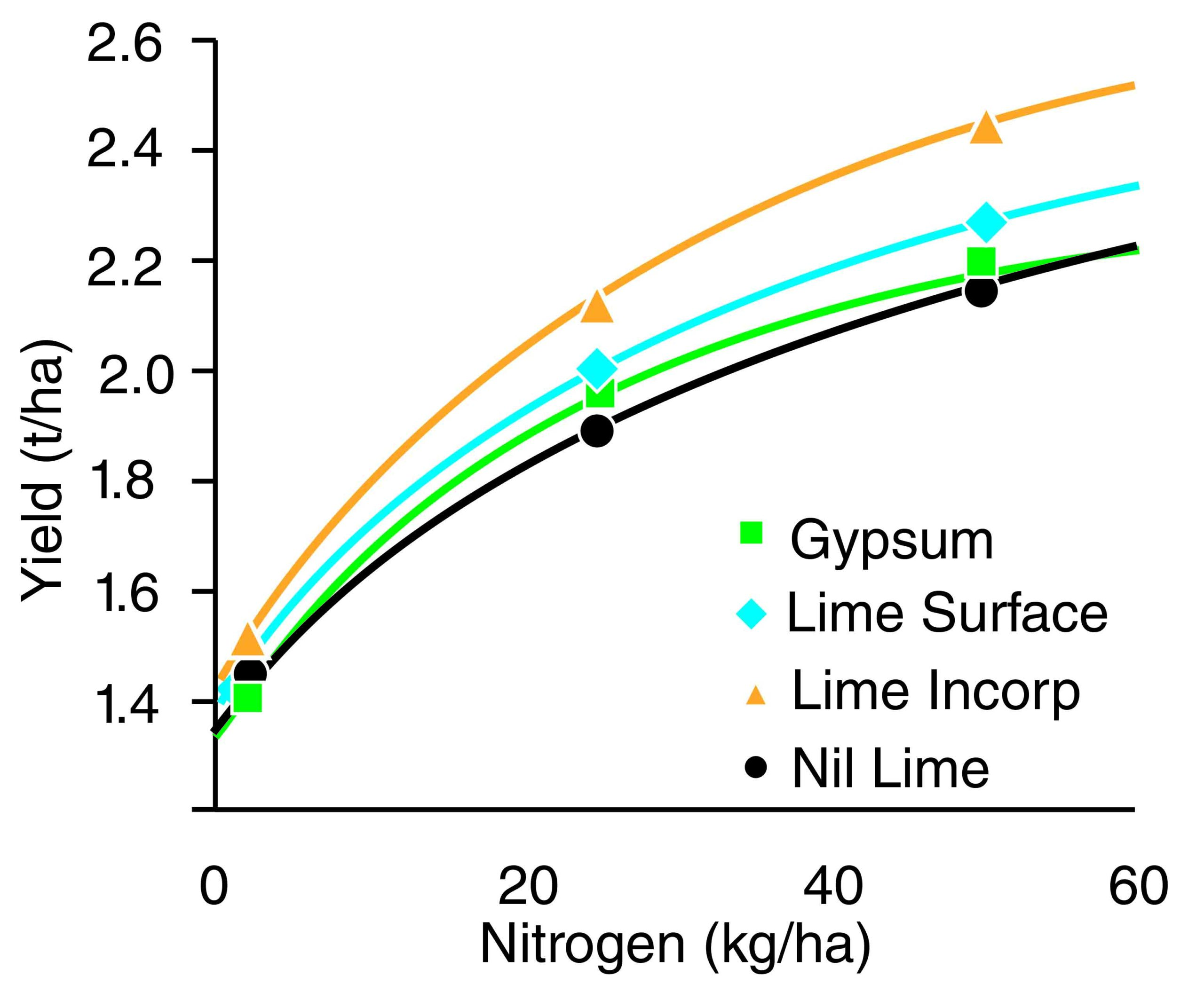 - Yields ranged from 1.2t/ha to 1.6t/ha, with significant differences between only the lowest and each of the two highest N strategies.
