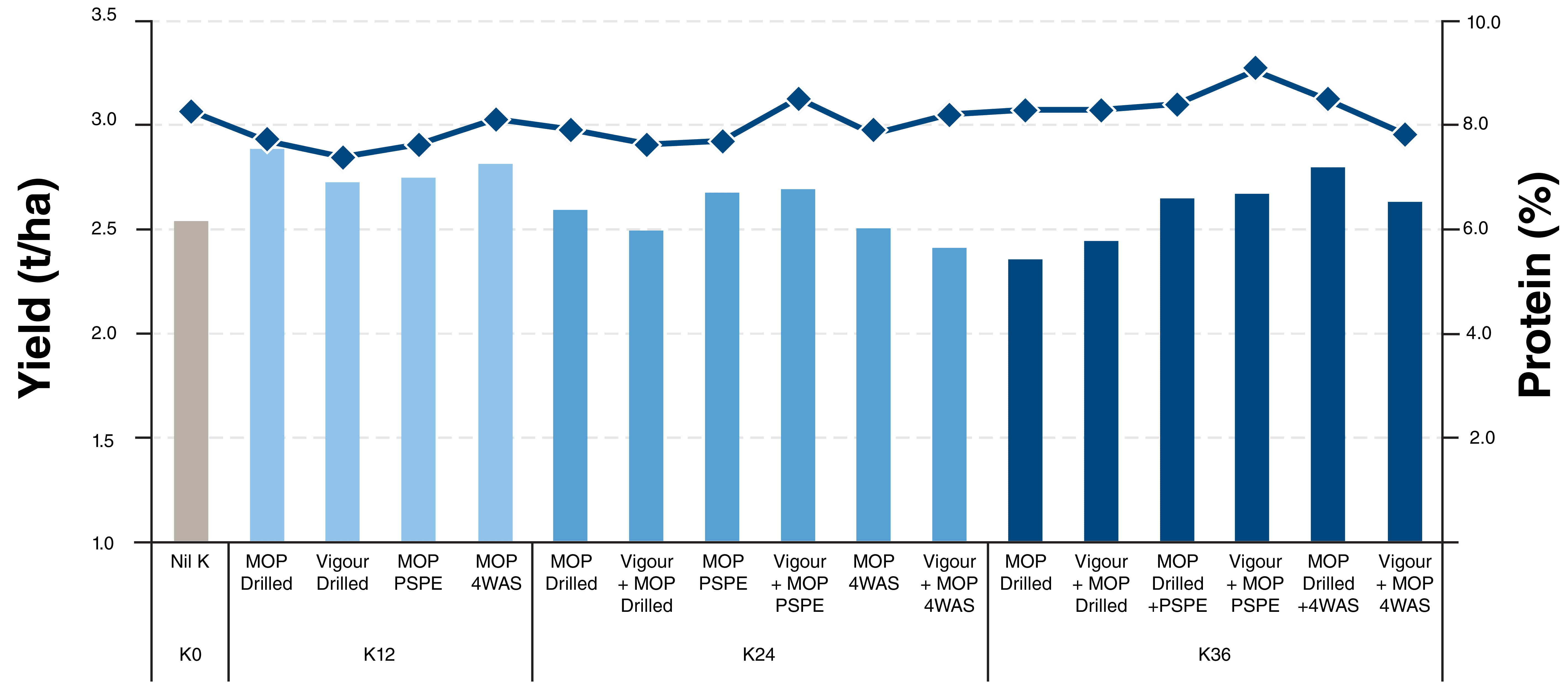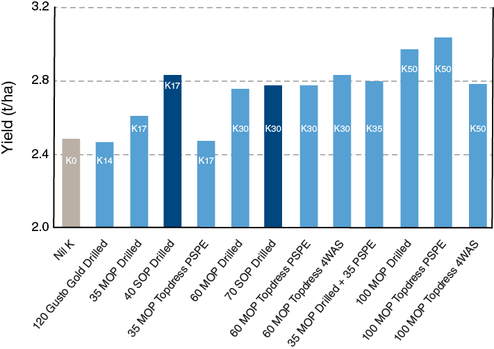 - With the bulk of pre sowing soil samples having levels below 40-50mg/kg Colwell K a yield response to K would be expected.