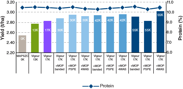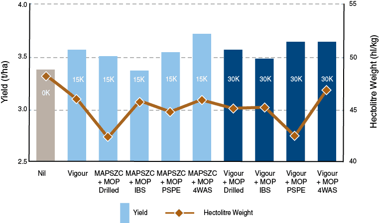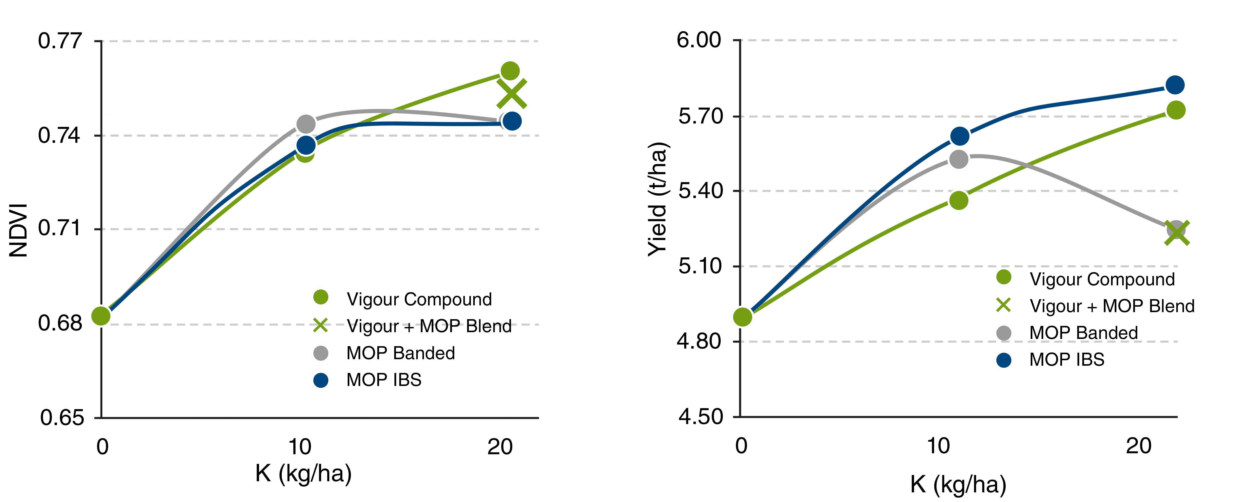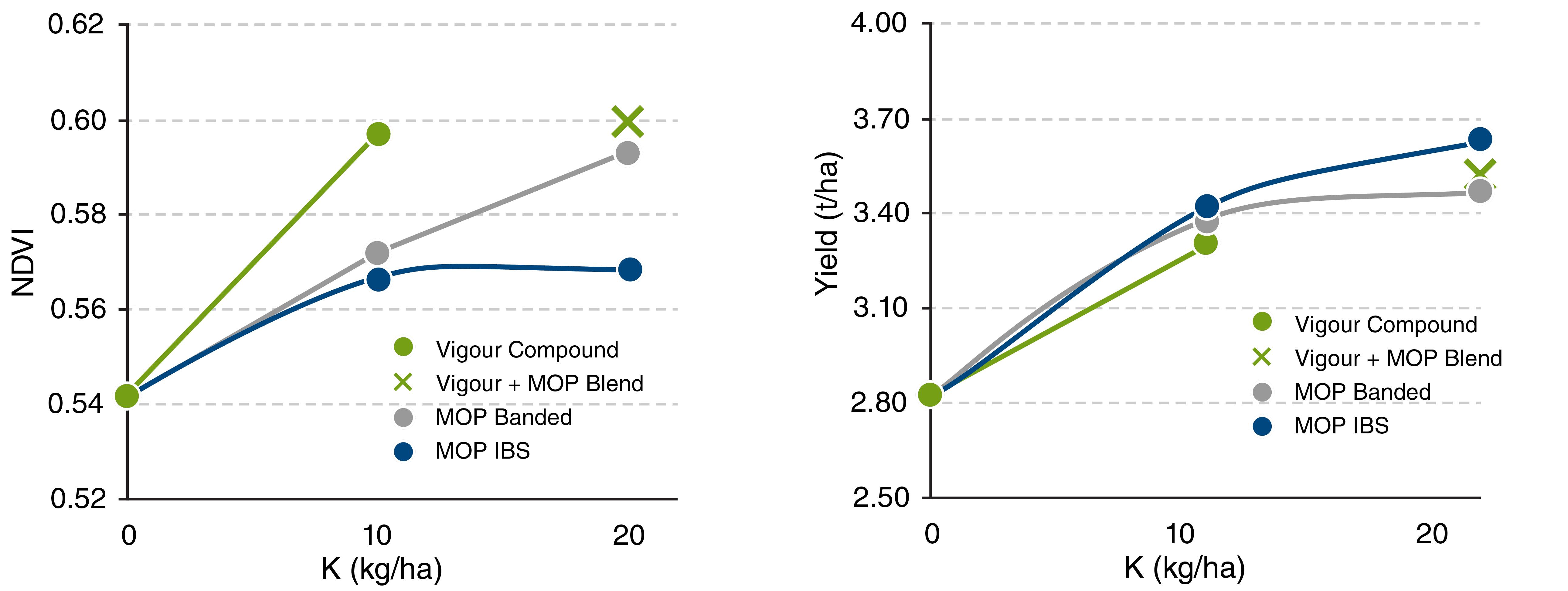 Notable is the performance of the NPKS compound fertiliser Vigour®,with lower total K than adjacent P treatments but contains all the plant nutrients in every granule for efficient plant uptake