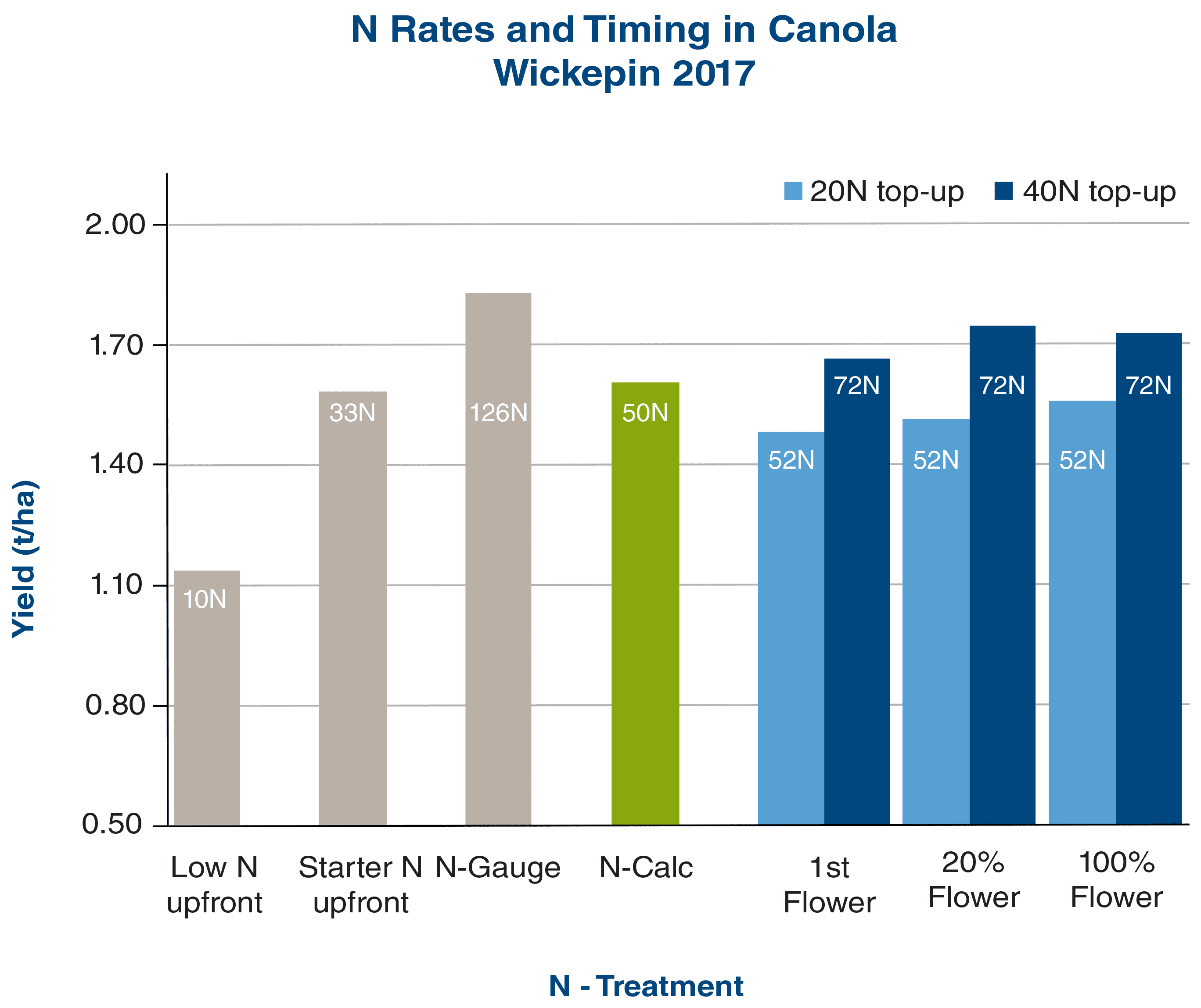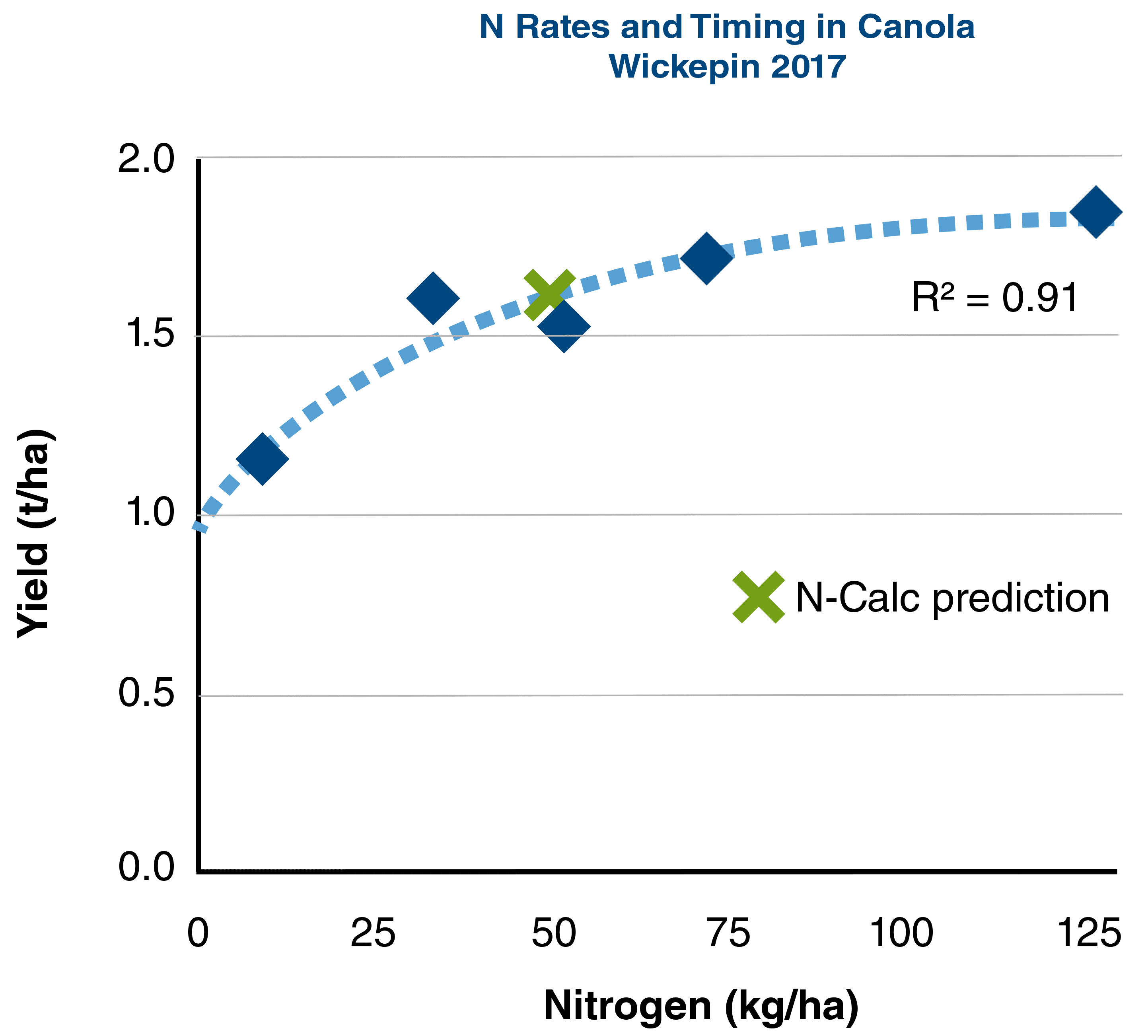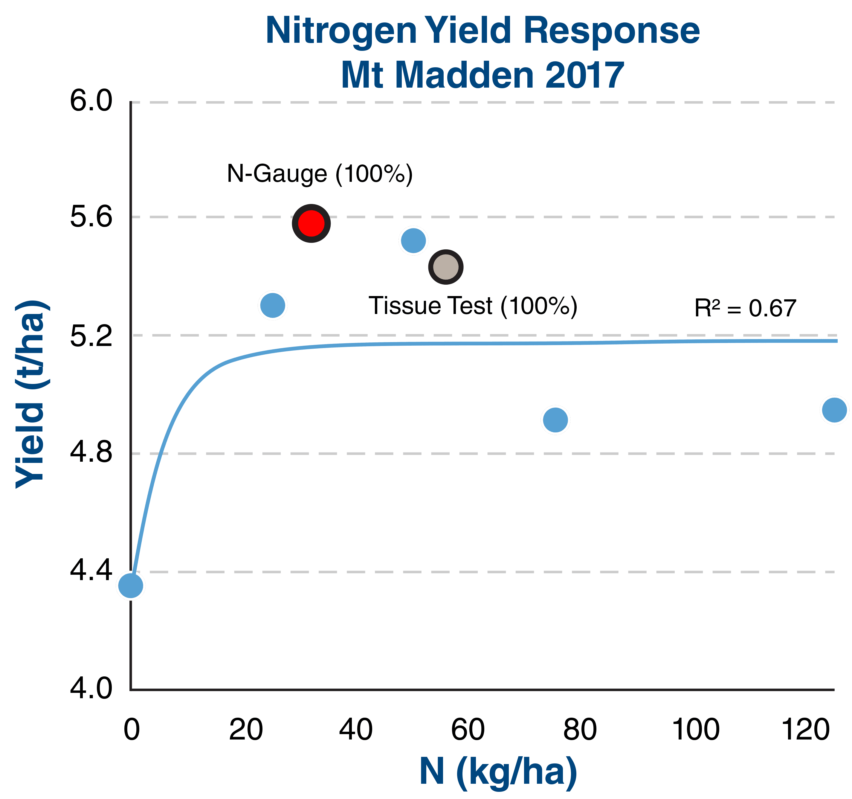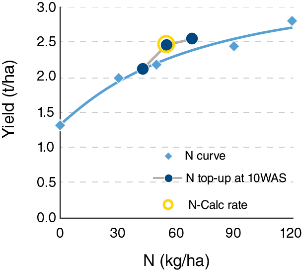 At this trial the N-calc did under predict yield and there was no yield improvement from 50% to 150% of the recommended rate. - Tissue testing is a very robust method for making in-season N decision but only shows if a crop is deficient. There is no process for gaining a specific top up application rate to counter act this deficiency.