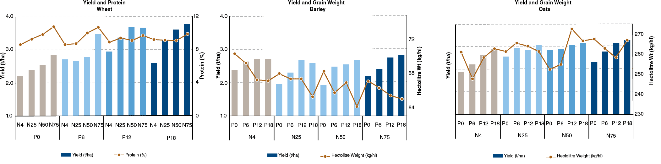 - There was a significant yield response to nitrogen rate, with barley varieties (2.31-2.97t/ha) yielding greater than wheat (1.74-2.59 t/ha).