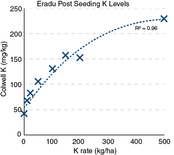 Other trials have contrarily shown responses to K fertiliser when Colwell K levels are well above 50 mg/kg.