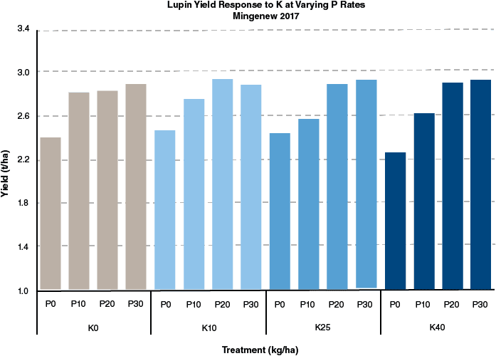 The highest yield was 2.94 t/ha which received 20P and 10K. The lowest was 2.27 t/ha from 0P and 40K. P application saw a notable and beneficial increase in lupin yield, with a 12% increase from 10P, and a 21% increase from 20-30P when compared with 0P. - Even though plant biomass was considerably less at higher K rates earlier in the season, this decrease did not express as strongly in yield.