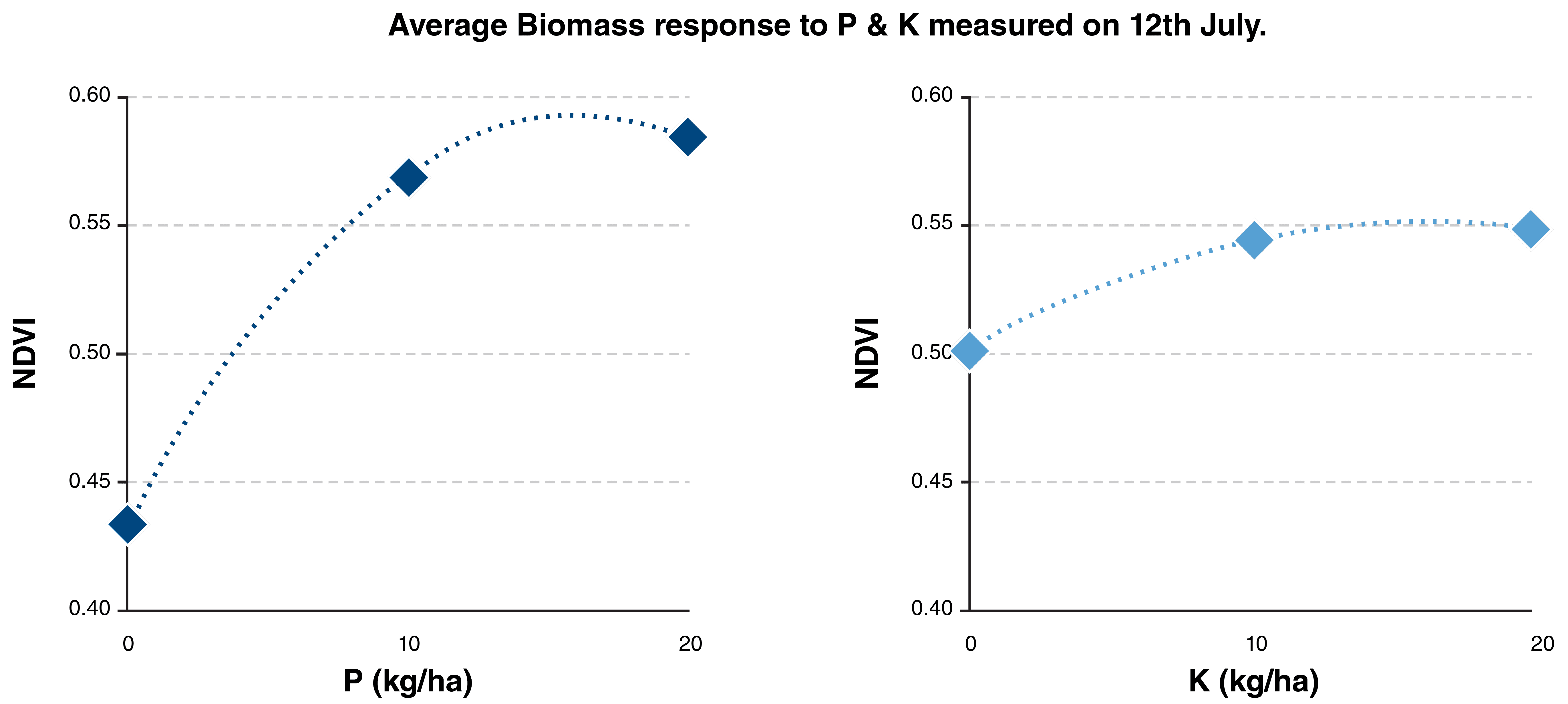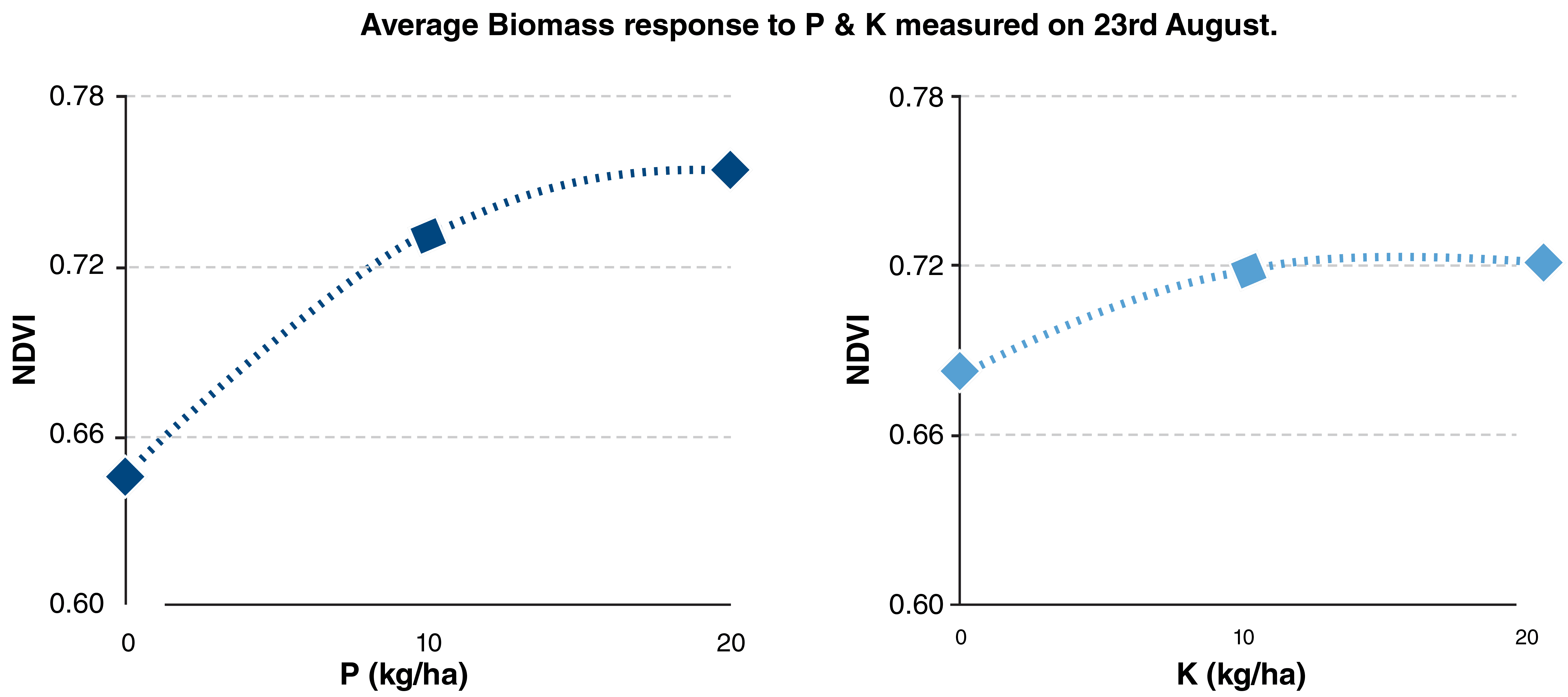 Plant sampling taken on the 23rd August demonstrated a strong biomass response to P and a slight increase to 10 and 20 kg/ha of K.