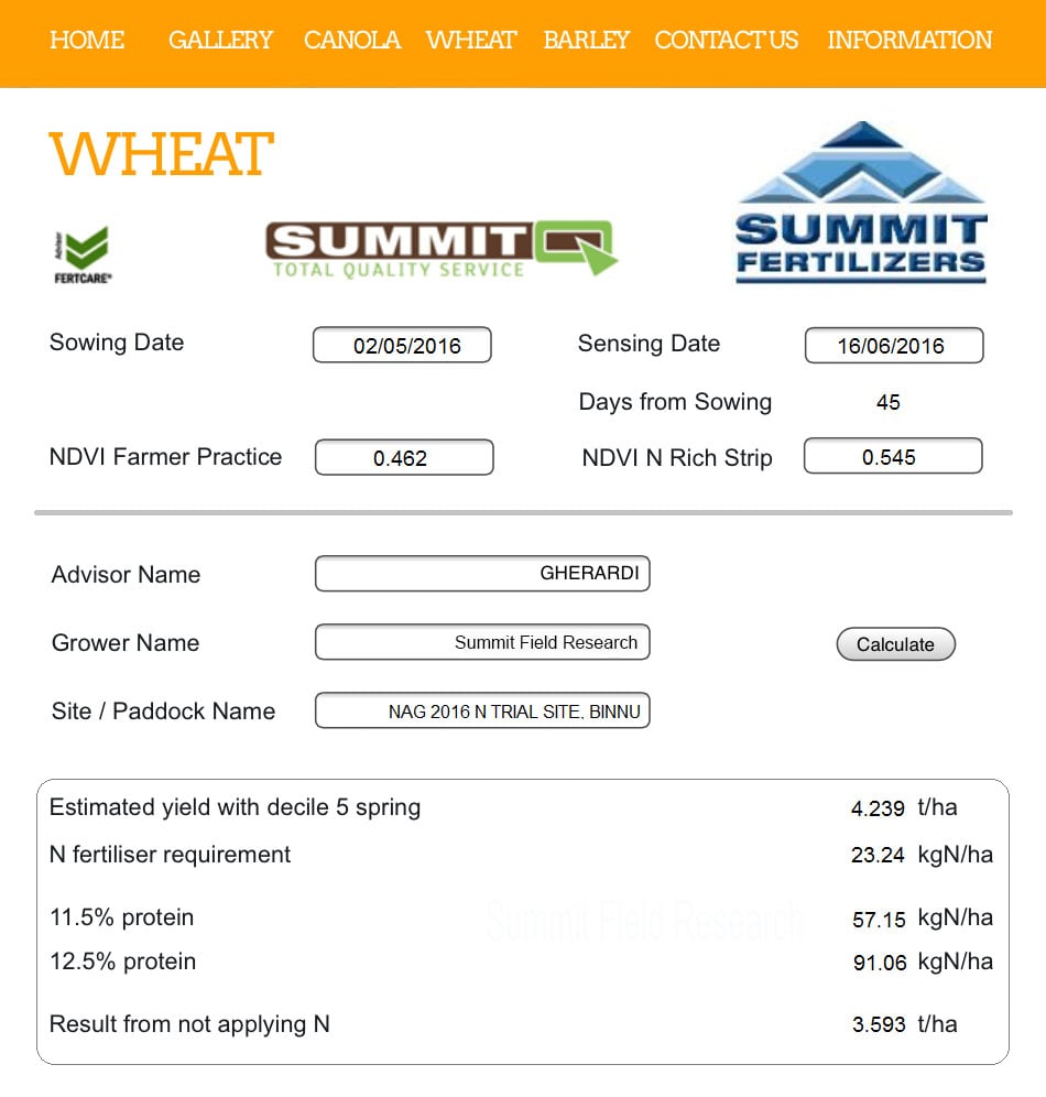 Summit’s In-Season Nitrogen Calculator aims to calculate a precise N rate to maximise the yield potential of a paddock where a crop is starting to run into N limitations, using NDVI as a real-time growth measurement.