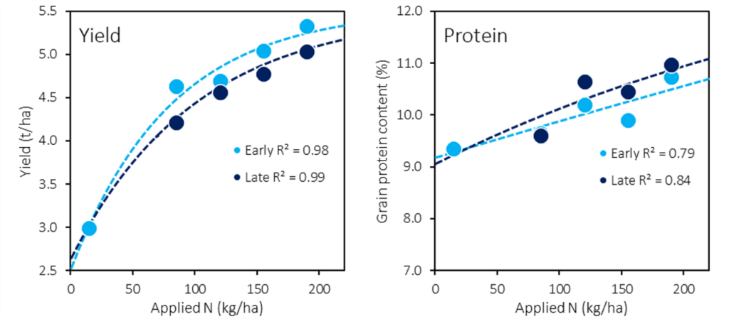 Figure 1: Comparison of early and late in-season nitrogen application on yield and grain protein accumulation at Dandaragan 2019.