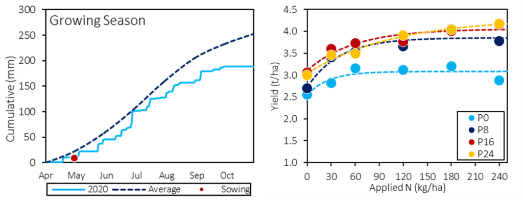 In 2020 the Apex Yield series continued, including a site near Corrigin. Soils at this site were moderate in P status and showed marginal surface K that increased with depth. This trial design incorporated N, P and K rates, with N in-particular applied to a high rate of 240 kg/ha. Despite challenging conditions post seeding and a decile 2 growing season rainfall of 188 mm (64 mm below average – Figure 2) individual plots of Scepter wheat in this trial achieved yields of up to 4.9 t/ha.