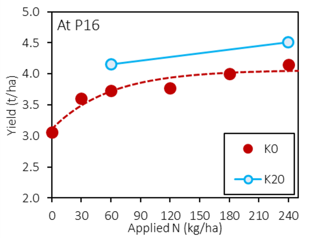 While increasing rates of P and N to such high levels achieved striking yield gains, the Corrigin site also showed how supplementary K can have an important supporting role. Applying 20 kg K/ha along with the banded P boosted yield by an additional 400 kg/ha (Figure 4).