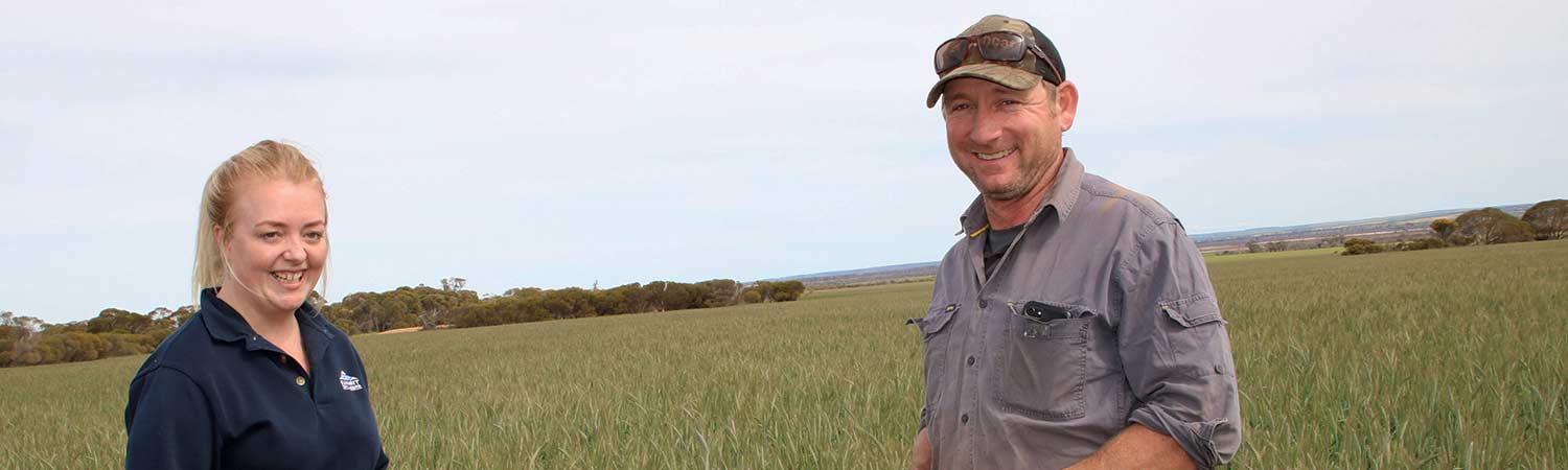 Carl Fuchsbichler of Koorda with local Summit Area Manager, Brenna Gray, in a very healthy crop of Berkshire triticale