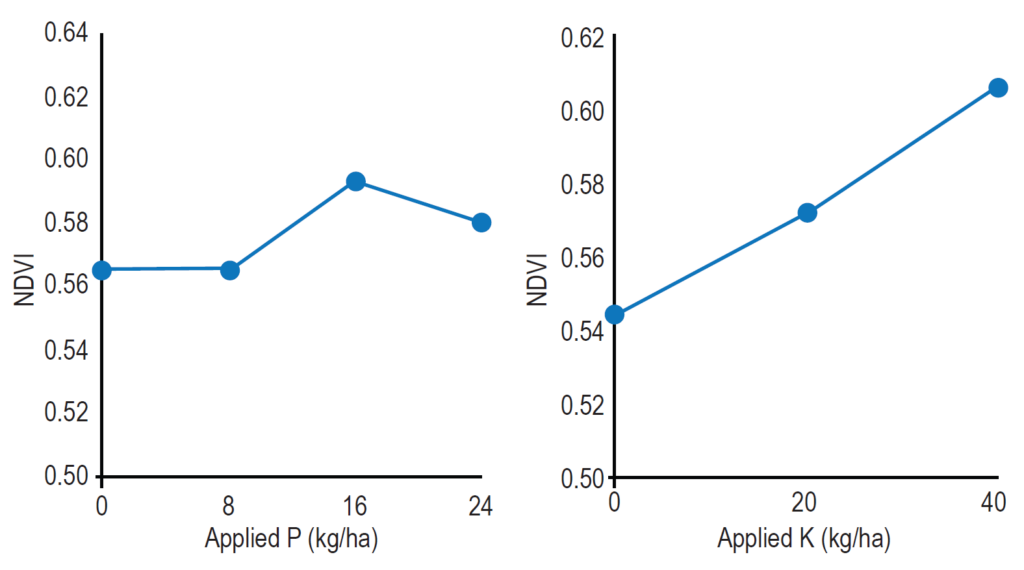 Figure 1: NDVI biomass data indicated good growth responses to K throughout the season, after testing showed 36 mg/kg of K in the top 10cm and 25 mg/kg of K in the next 20cm of soil. There appears to be limited responses to P at this site.