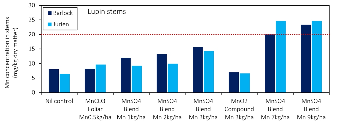 Form of Mn applied is important. Supplying Mn in the MnO2 form appears completely ineffective for Barlock lupin production. The impact of MnO2 on Jurien lupin yield was not as pronounced.