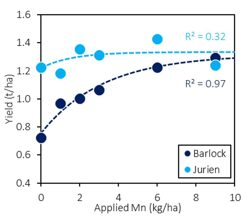 Jurien produced higher yields than Barlock, averaging 1.3t/ha compared to 1.0 t/ha respectively, but Barlock had stronger yield responses to increasing Mn rates than Jurien.