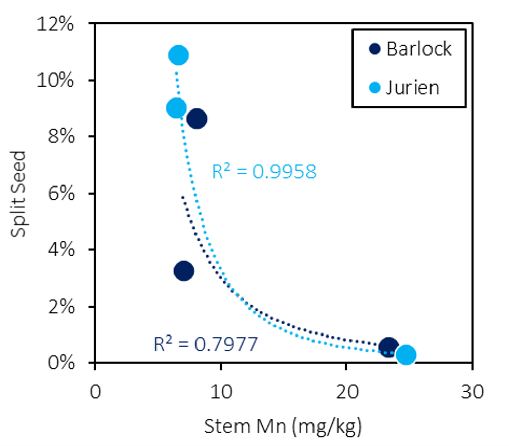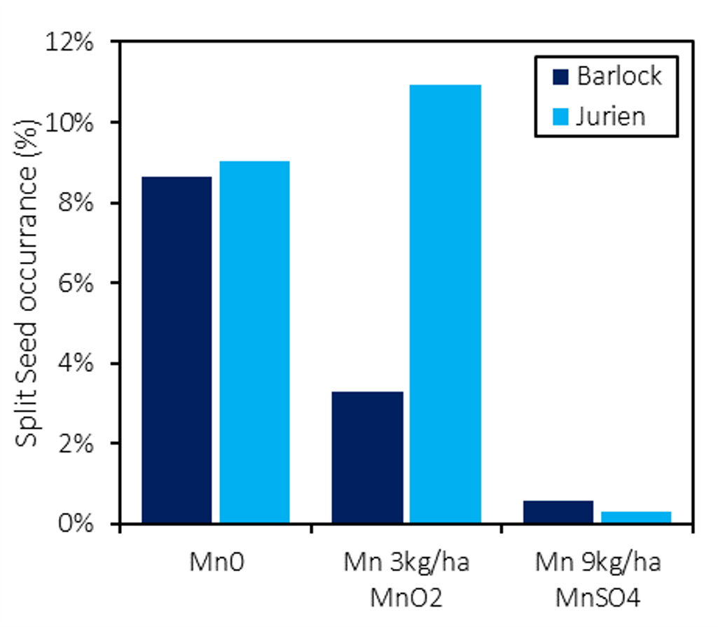 In contrast to yield, MnO2 increased prevalence of split seed in Jurien, not Barlock.