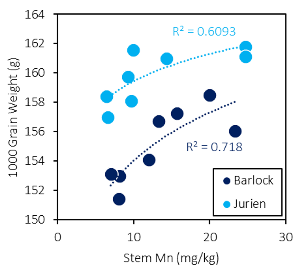 3 kg/ha Mn was adequate to optimise Jurien yield and profit, whereas >6 kg/ha was required by Barlock.